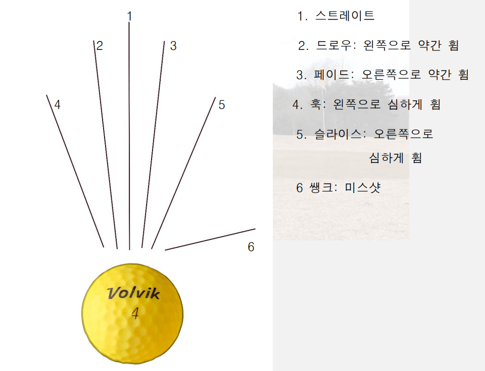 골프에서는 다양한 샷을 사용합니다. 스트레이트 샷은 공을 일직선으로 날려, 최대한 멀리 쳐내는 것을 목표로 합니다. 드로우는 오른쪽에서 왼쪽으로 약간 휘어지는 샷으로, 파워와 곡선을 조절하여 멋진 결과를 얻을 수 있습니다. 페이드는 그 반대로 왼쪽에서 오른쪽으로 약간 휘어지는 샷으로, 드로우와 페이드는 고난도의 컨트롤 능력을 요구합니다. 훅은 왼쪽으로 90도 가까이 휘는 샷, 슬라이스는 오른쪽으로 90도 가까이 휘는 샷으로 공의 비정상적인 운동 경로를 갖는 샷입니다. 주로 비기너 골퍼에게 나타나는 특징으로 원하지 않는 샷의 결과입니다.