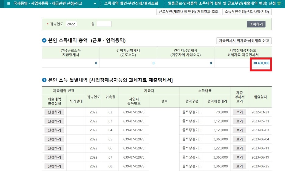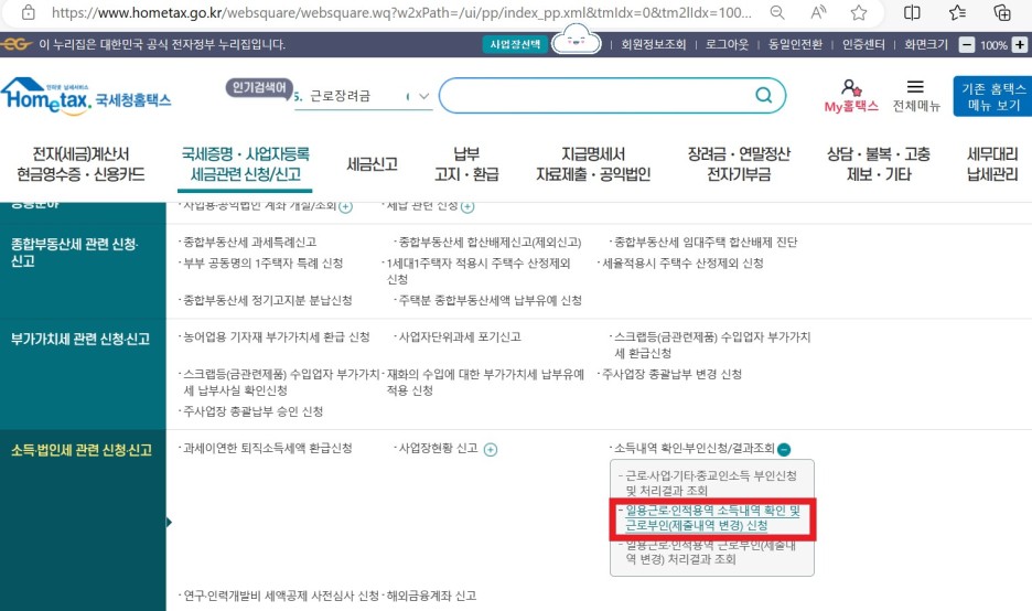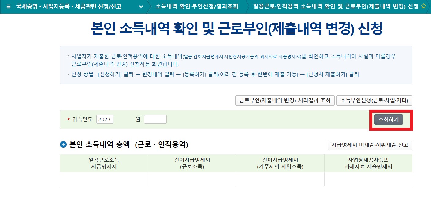 4. 일용근로 인적용역 소득내역 확인 및 근로부인(제출내역 변경) 신청 클릭