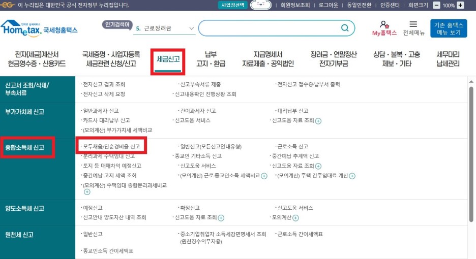세금신고에서, 종합소득세신고, 모두채움/단순경비율 신고 클릭