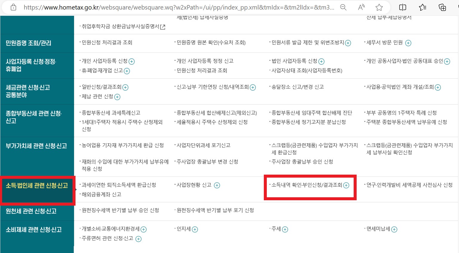3. 소득법인세 관련 신청신고 항목에서 소득내역 확인부인신청/결과조회 클릭