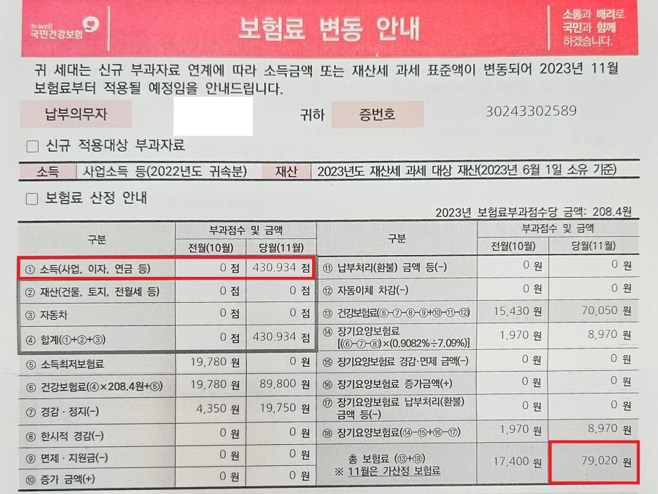 종합소득세를 신고하기 전에 보험료는 17,000원 정도 되었는데, 11월부터 79,020원으로 변동되었습니다. 건강보험료는 함께 거주하는 가족이 있으면, 조금 완화될 수 있습니다.
