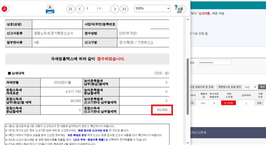 위 사진은 제가 30,400,000원을 신고하여 낸 종합소득세 영수증입니다. 기한 후 신고를 해서 가산세가 합쳐져 89,569원을 부과했고, 가산세를 포함하지 않으면 74,000원 정도 산출되었습니다.