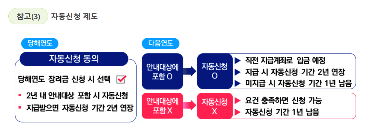 5. 자동신청 제도: 60세 이상 고령자와 중증 장애인이 장려금 신청 기간에 동의하면, 향후 2년 내 신청 안내 대상에 포함될 경우 자동으로 신청됩니다.